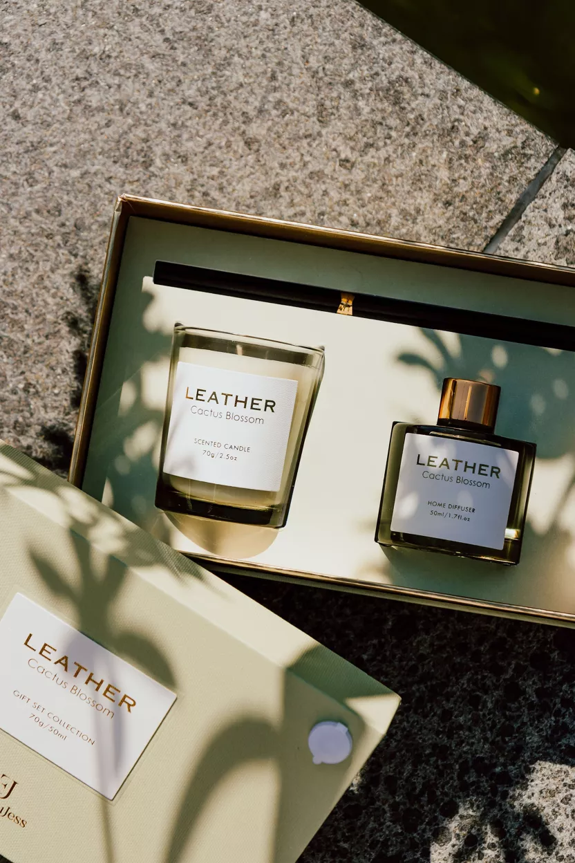 The Cactus Blossom Leather Feel Gift Pack includes not only a refreshing diffuser but also a carefully crafted candle. Create a vibrant and soothing atmosphere with the soft glow and invigorating aromas of cactus blossom and leather. It’s more than just a gift; it’s an invitation to enjoy the perfect balance of nature and luxury.