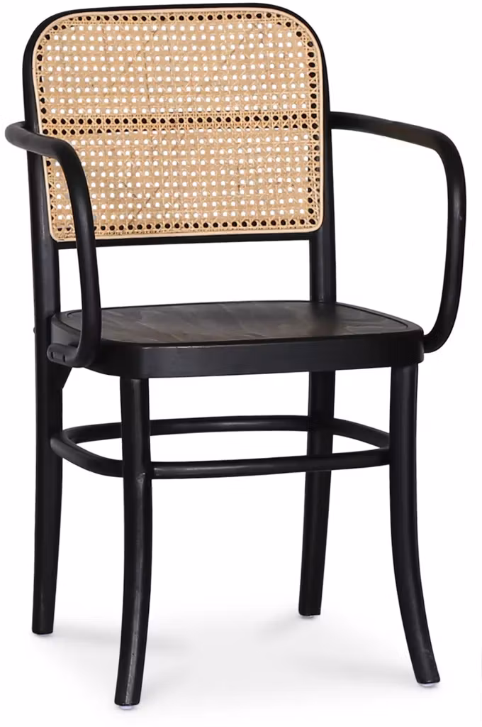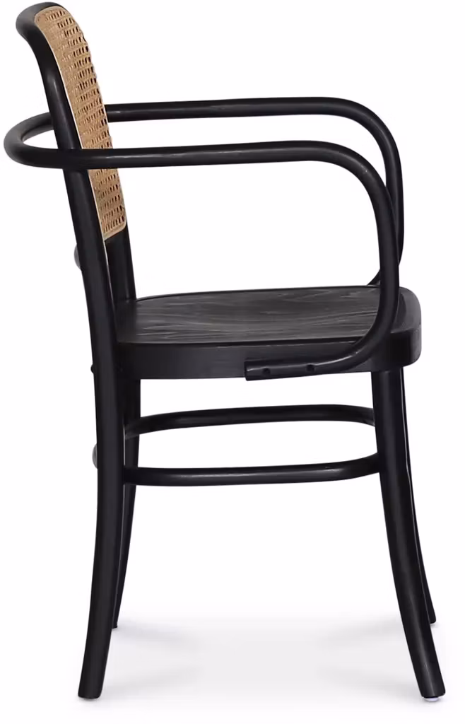 Karmstol med svart stomme av böjträ, tillverkad av bok. Sits i trä och ryggstöd i naturfärgad rotting.
