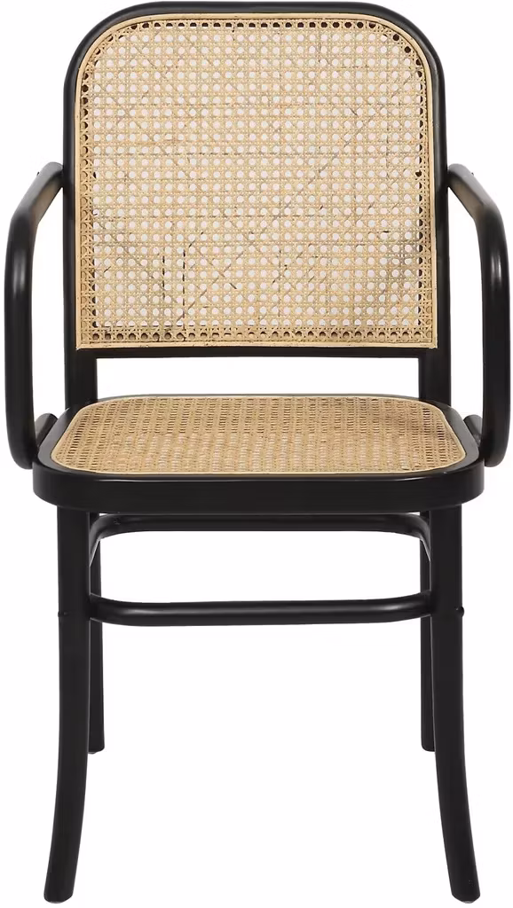 Tone är en gedigen karmstol med rotting i både sits- och rygg. Tillverkad i svartlackad massiv alm. Klassisk stol till matbordet.