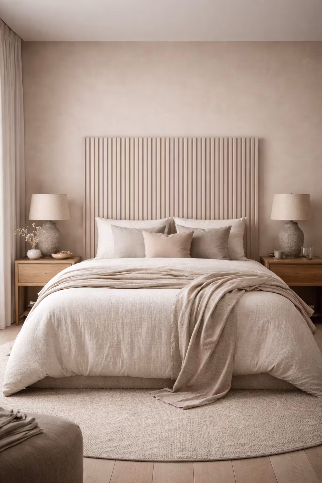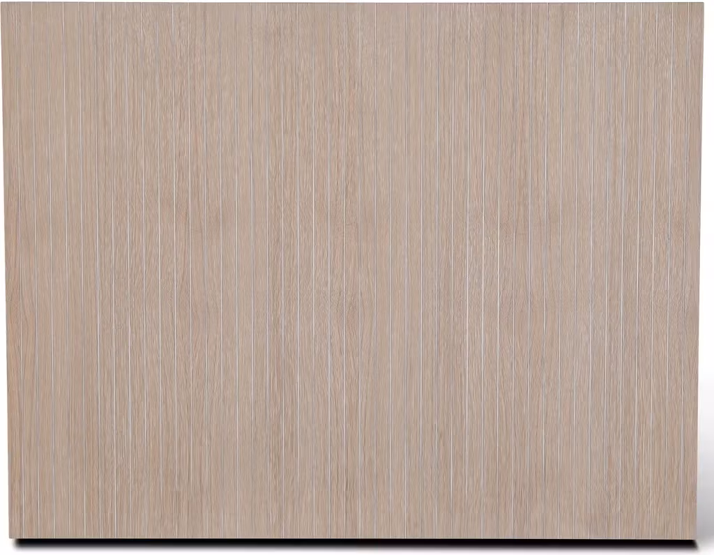 Volume sänggavlar i massivt ribbat trä. Fasade horisontella linjer. Sänggavelpanelen används antingen till 90 cm enkelsäng eller byggs på med flera väggpaneler för att få en bredare sänggavel. Väggpanelen är antingen golvstående och kläms mellan väggen och sängen eller hängs upp på väggen med medföljande väggfäste. Sänggavelns yta är gjort i naturligt vitpatinerad ekfanèr för att ge en exklusiv och naturlig känsla i sovrummet.